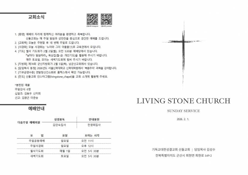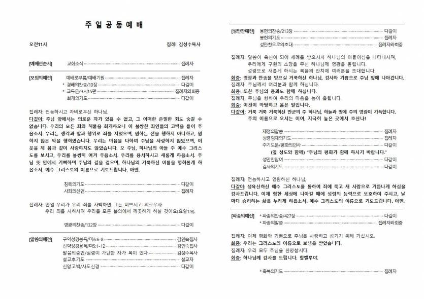 20260201 주보 페이지 정보 작성자 관리자 조회 83회 작성일 2026.01.31 본문 20260201 주현절 후 네 번째 주일 목록 이전글20260208 주보 - 26.02.07 다음글20260125 주보 - 26.01.24