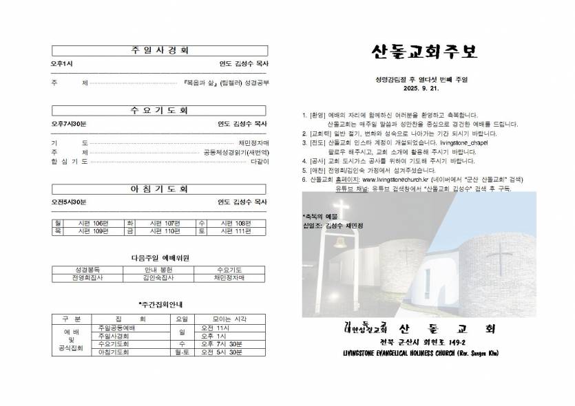 20250921 주보 페이지 정보 작성자 관리자 조회 110회 작성일 2025.09.20 본문 20250921 성령강림절 후 열다섯 번째 주일 목록 이전글20250928 주보 - 25.09.26 다음글20250914 주보 - 25.09.13