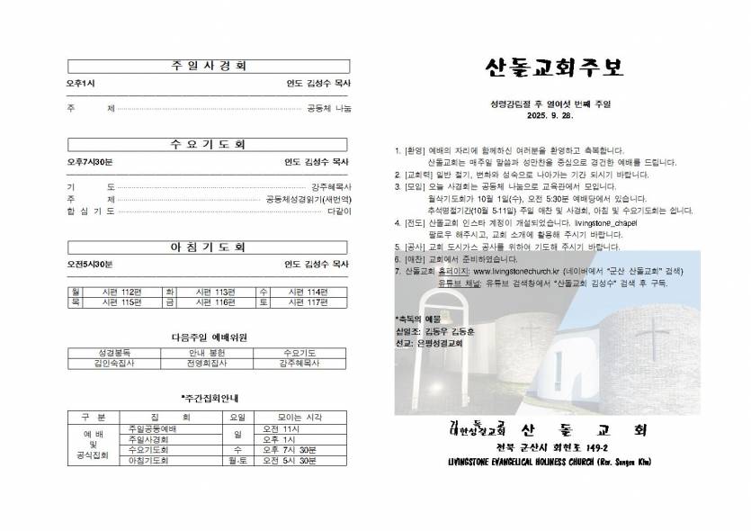 20250928 주보 페이지 정보 작성자 관리자 조회 73회 작성일 2025.09.26 본문 20250928 성령강림절 후 열여섯 번째 주일 목록 이전글20251005 주보 - 25.10.04 다음글20250921 주보 - 25.09.20
