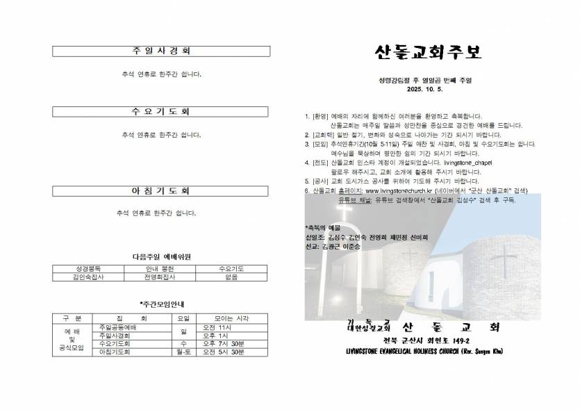 20251005 주보 페이지 정보 작성자 관리자 조회 66회 작성일 2025.10.04 본문 20251005 성령강림절 후 열일곱 번째 주일 목록 이전글20251012 주보 - 25.10.11 다음글20250928 주보 - 25.09.26