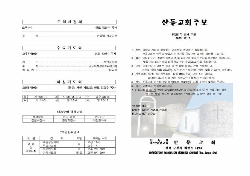 20251207 주보 페이지 정보 작성자 관리자 조회 189회 작성일 2025.12.06 본문 20251207 대림절 두 번째 주일 목록 이전글20251214 주보 - 25.12.13 다음글20251130 주보 - 25.11.29