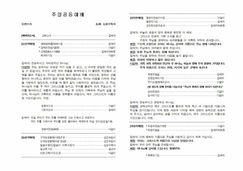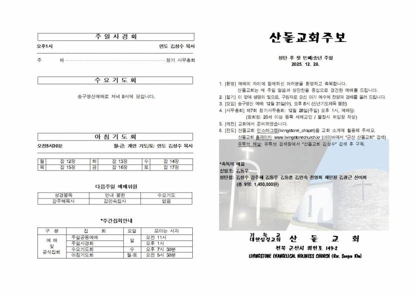 20251228 주보 페이지 정보 작성자 관리자 조회 168회 작성일 2025.12.27 본문 20251228 성탄 후 첫 번째 주일 목록 이전글20251231 주보 - 25.12.31 다음글20251225 주보 - 25.12.24