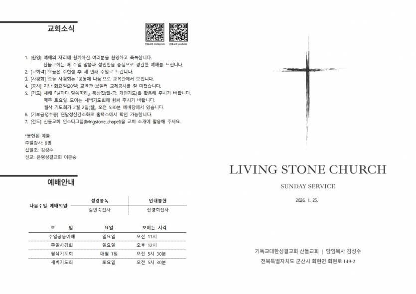 20260125 주보 페이지 정보 작성자 관리자 조회 155회 작성일 2026.01.24 본문 20260125 주현절 후 세 번째 주일 목록 이전글20260201 주보 - 26.01.31 다음글20260118 주보 - 26.01.17